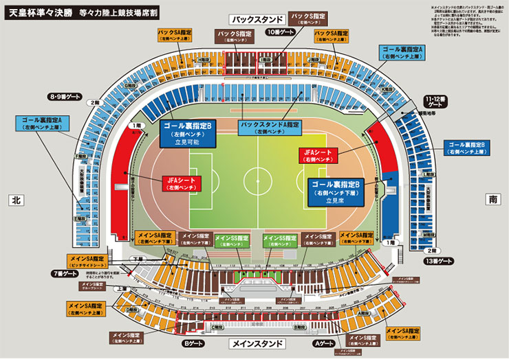 | SA指定席 | メイン下層(左側ベンチ/右側ベンチ) メイン上層(左側ベンチ/右側ベンチ) バック上層(左側ベンチ/右側ベンチ) ピッチサイドシート |