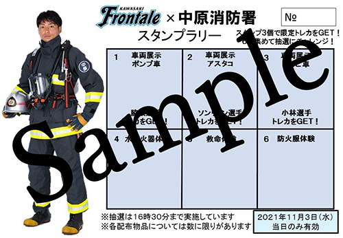 | 内容 | 中原消防署とフロンターレがコラボした激レアグッズがもらえる&当たる「消防スタンプラリー」を九ランドエリア①内で開催!