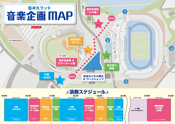 当日は坂本九さんの音楽と九さんの名前″キュウ″に関連する企画が目白押し!その数なんと36ブース!!(ホントは99やりたかった!)この日の試合はキックオフ時間が13:00と早いため、イベント時間は午前10:00から試合を挟んで午後16:30まで開催いたします。試合前も試合後も(試合中も公園利用者を対象にオープンしています)坂本九ランドを思う存分楽しんでください。