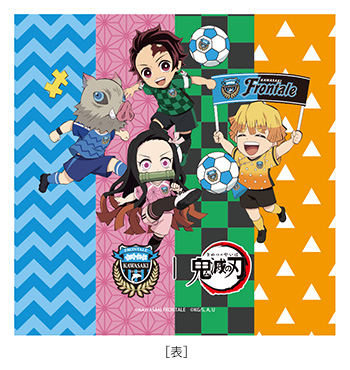 鬼滅の刃のキャラクターがフロンターレデザインのサッカーボールで遊んでいる様子をデザインしたキーホルダーと、ふろん太&カブレラ&ワルンタが鬼滅の刃キャラクターの衣装を着たここだけでしか手に入れられないグッズ!