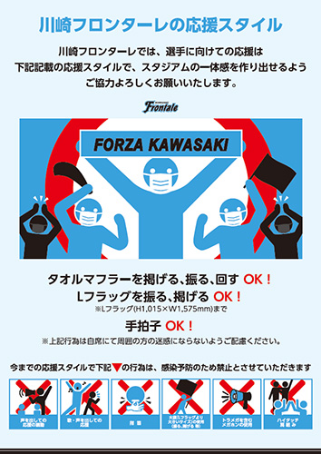 ※詳しいエリアについてや、「Jリーグ新型コロナウイルス感染症対応ガイドライン」に基づいた観戦マナー等については、こちらをご確認ください。 【ご来場の皆様へのお願い】 選手に向けての応援は、下記記載の応援スタイルで、スタジアムの一体感を作り出せるようご協力よろしくお願いいたします。 タオルマフラーやLフラッグの購入はJリーグオンラインストアで ○Paint it Blueで等々力を青く染めましょう! |