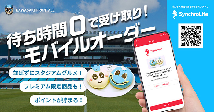 通常、メインスタンド場内総合案内所横グッズ売店前(AZZURRO NERO in等々力)で受け渡しをしている「SynchroLife(シンクロライフ)」のモバイルオーダー。今回はより多くの方に受け取っていただきたくフロンパークグッズ売店横にて受け渡しを実施いたします。