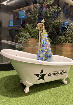 FROCAFE/AZZURRO NEROの入り口に置いてある2021優勝記念ロゴ入りバスタブが、