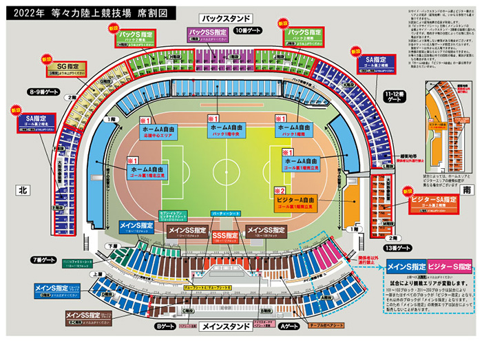 サイド・バックスタンドの1階「※1ホームA自由」、「※2ビジターA自由」の運用については、原則「自由席」運用となります。 ①「自由席」運用時:「ホームA自由」、「ビジターA自由」として販売 ◎指定席運用時の「ホームA指定ゴール裏1階北・南(立見)」、「ビジターA指定ゴール裏1階南(立見)」の配席については、感染対策として、原則「左右1席空き」で運用いたします。 |