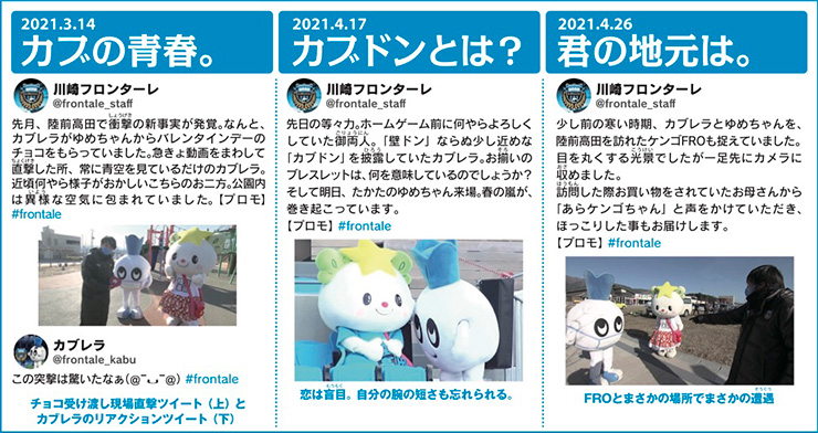 2011年、陸前高田市内の小学校に算数ドリルを届けたことから交流が開始。2015年の友好協定「高田フロンターレスマイルシップ」締結以降も、2016年に「高田スマイルフェス2016」の開催、陸前高田ランドの物産を川崎で堪能することのできる「陸前高田ランド」の開催。2019年からは陸前高田市内の農業の普及・復興を目的とした「ふろん田」プロジェクトを始動。実際に田んぼで収穫されたお米より日本酒「青椿」を製造・販売しているなどさまざまな形での交流を行っています。
