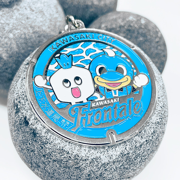 川崎フロンターレのマンホールをモチーフにしたメタルキーホルダー。