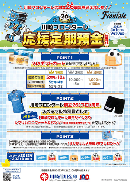川崎信用金庫「川崎フロンターレ応援定期預金(懸賞付)」発売のお知らせ