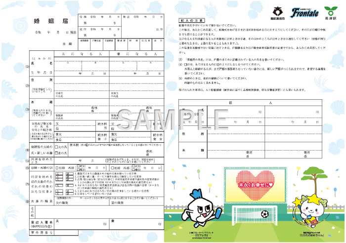 そして、三者を結ぶ川崎フロンターレのマスコット「カブレラ」と陸前高田市ゆめ大使「たかたのゆめちゃん」のゴールインをお祝いするべく、「カブレラ・ゆめちゃん デザイン婚姻届」を作成しました