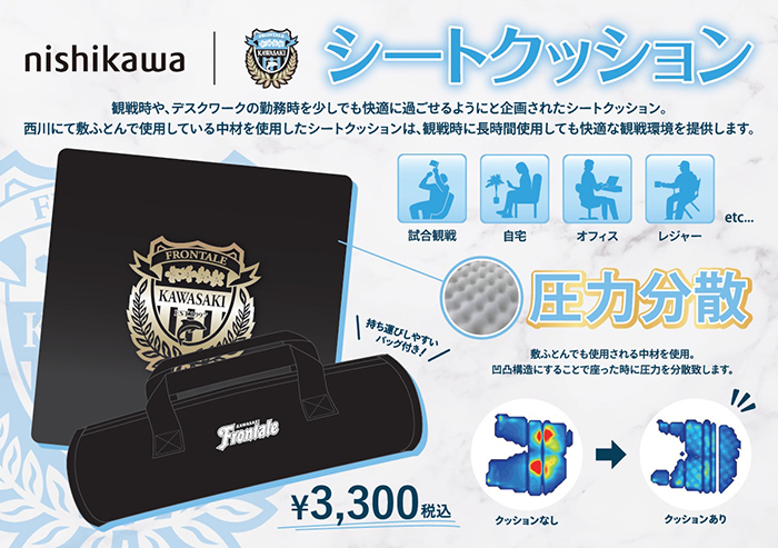 寝具メーカー『西川』製の高反発素材のシートクッション。スタジアム観戦時やデスクワークをより快適に過ごせる便利グッズ! 寝具メーカーの西川で販売されている敷ふとんで使用されている中材を採用しており、凸凹構造にすることによって、座った時の圧力を分散させます。長時間使用しても快適に、そして寒い時期に冷たくなる座席対策としてもオススメ。持ち運びが出来るオリジナル収納ケース付き。