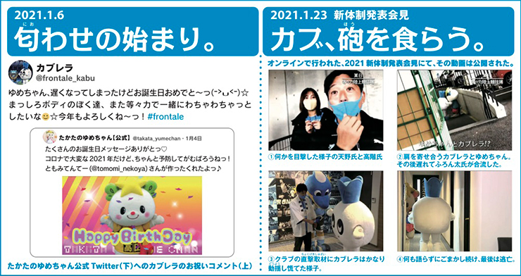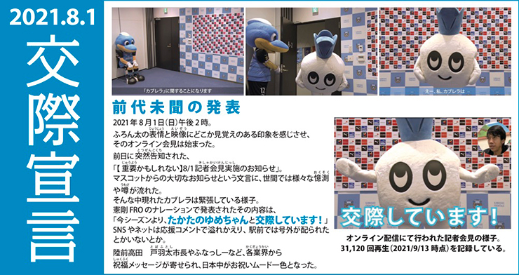 それが縁となり、「カブレラ」と「たかたのゆめちゃん」が2021年8月1日(日)にマスコット史上初の「交際宣言」をし、10月2日(土)にカブレラがプロポーズ。そして11月27日(土)、遂にゴールインパーティ実施の発表をいたしました。
