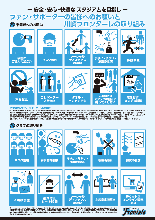 川崎フロンターレでは、新型コロナウイルス感染拡大防止を徹底し『安全・安心・快適』なスタジアムを目指し引き続き、尽力いたします。皆様のご理解とご協力をお願い申し上げます。