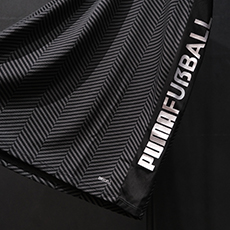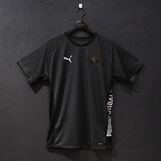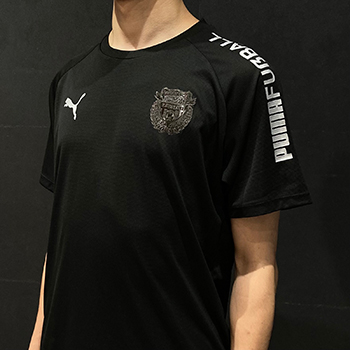オフピッチでも活躍するTシャツ。シンプルな黒の無地に袖の「PUMA FUSSBAL」の文字が映えるデザインとなっています。