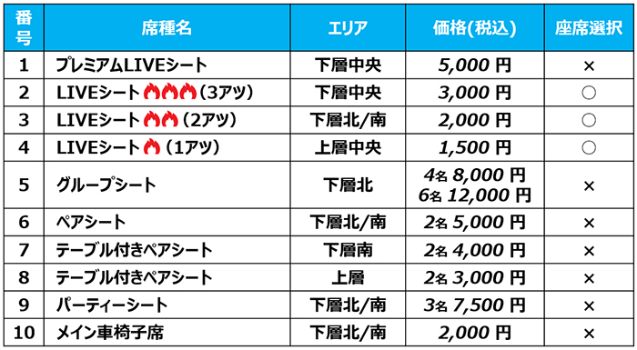 ※LIVEシート(1アツ)、テーブル付きペアシート(上層)につきましては、上層のため立ち上がってのLIVE参加はご遠慮いただきますようお願いいたします。また、座席位置によってLIVE音声の聞こえ方が異なります。