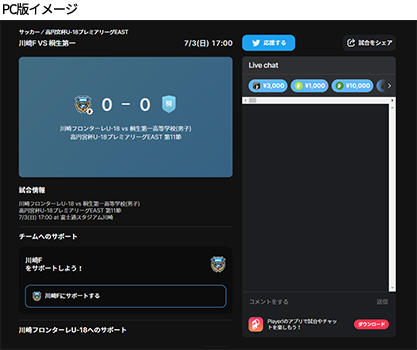 今シーズンもフロンターレアカデミーの選手たちの戦いぶりをタイムリーに皆さんにお届けするため、スポーツライブエンターテイメントアプリ「Player!」にて試合速報を実施します。