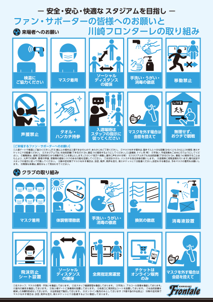 クラブとしてもこれまで以上に感染拡大防止の取り組みを実施していきますが、ファン・サポーターの皆様にも試合を安全に開催するためには、以下の記載事項についてご理解とご協力が不可欠となりますので、何卒よろしくお願いいたします。