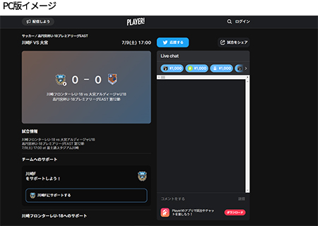 今シーズンもフロンターレアカデミーの選手たちの戦いぶりを皆さんにお届けするため、スポーツライブエンターテイメントアプリ「Player!」にて試合結果の速報を実施します。