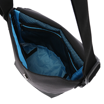 前面に小分けできる収納ポケットが3つ付いているバックパックです。ブラックボディにファスナー部分をフロンターレブルーにしたシンプルな仕様です。
