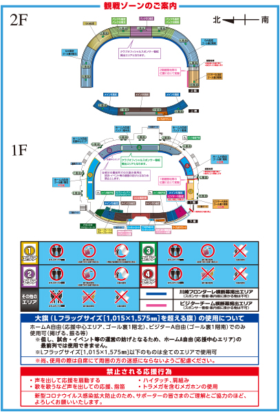 | ・大旗(Lフラッグサイズ[1,015×1,575mm]を超える旗)の使用について ホームA自由(応援中心エリア、ゴール裏1階北)、ビジターA自由(ゴール裏1階南)でのみ使用可(掲げる、振る等) ※ただし、試合・イベント等の運営の妨げとなるため、ホームA自由(応援中心エリア)の最前列では使用できません。 ※Lフラッグサイズ[1,015×1,575mm]以下のものは全てのエリアで使用可 ※なお、使用の際は自席にて周囲の方の迷惑にならないようご配慮ください。 |