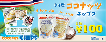 ピーケイサイアムは、タイ王国の食に関するトータルサプライヤーとして活動しています。コロナ禍で海外旅行に行けない環境が続いていますが、より多くの方々にタイ王国の魅力に触れて、知っていただけるように食品や飲料の販売を行っています。 ◇ココサムボックス 1個 500円 ◇タイ産お菓子 1袋 200円 ◇タイ産ココナッツチップス 1袋 100円 |
