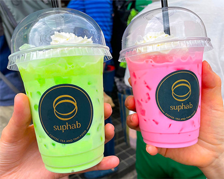 スパーブは面白さが溢れるクリエティブなカフェです。 ◇ピンクミルク 650円 ◇グリーンミルク 650円 ◇トムヤム・ハニーソーダ 650円 ◇タイミルクティー 650円 ◇オーリアン(タイコーヒー) 550円 ◇ロンガンジュース 650円