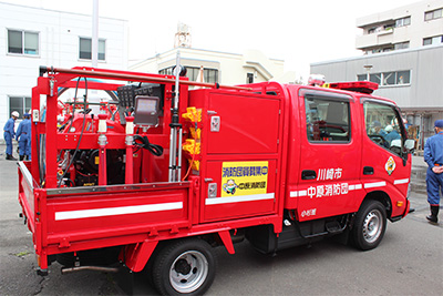 大人も昔はみんな子ども!! 子どもたち憧れの緊急車両がスタジアム前にやってくる! ①消防ポンプ自動車 ②小型動力ポンプ積載車(消防団車両)