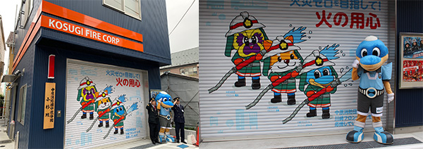 ※小杉班の車両がある器具置場のシャッターは、フロンターレとのコラボデザインとなっています。 |