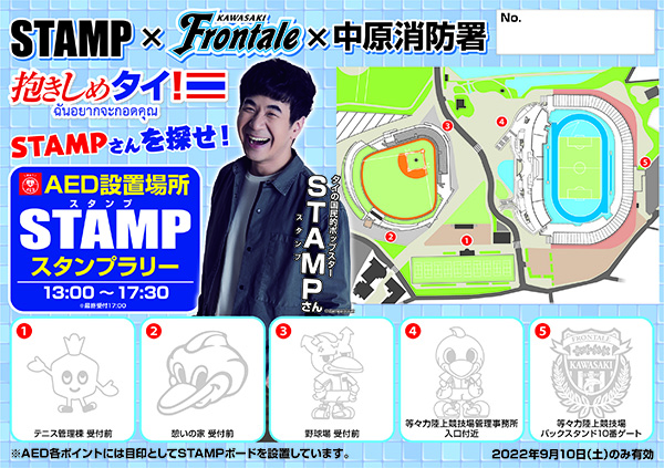 題して「STAMPスタンプラリー」! ぜひ、これを機に等々力緑地内のAEDの設置場所を把握して緊急事タイに備えましょう!