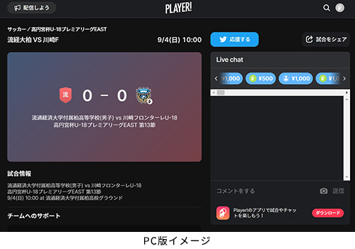 今節は試合観戦に制限が設けられるため、フロンターレアカデミーの選手たちの戦いぶりをタイムリーに皆さまへお届けするため、スポーツライブエンターテイメントアプリ「Player!」にて試合速報を実施します。コメントを書き込むこともできますので、皆さまぜひご覧ください。