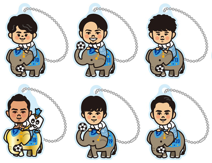 選手たちが象に乗った!?イラストだからこそできる抱きしめタイ!イベントに合わせたアクリルキーホルダーです。