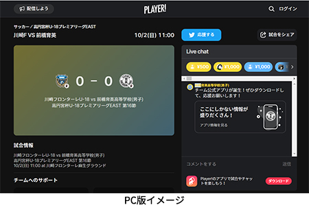 今シーズンもフロンターレアカデミーの選手たちの戦いぶりをタイムリーに皆さんにお届けするため、スポーツライブエンターテイメントアプリ「Player!」にて試合速報を実施します。
