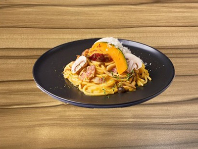 ◇KABOCHA MILKと秋野菜、ホエー豚ベーコンのクリームパスタ