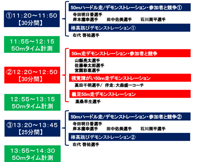 当日は50mタータン上にて「短距離」「ハードル」「視覚障害短距離」の実走のほか、棒高跳びのデモンストレーションを実施予定。沿道から迫力ある陸上パフォーマンスをお楽しみください!