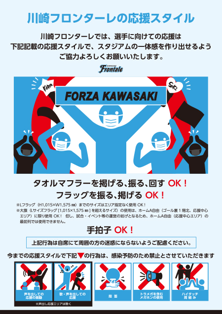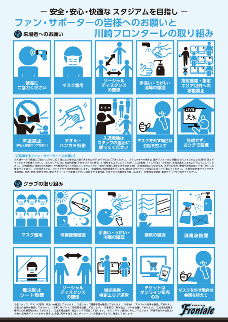 クラブとしてもこれまで以上に感染拡大防止の取り組みを実施していきますが、ファン・サポーターの皆様にも試合を安全に開催するためには、以下の記載事項についてご理解とご協力が不可欠となりますので、何卒よろしくお願いいたします。