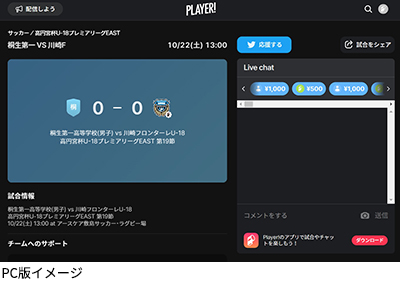 今シーズンもフロンターレアカデミーの選手たちの戦いぶりをタイムリーに皆さまへお届けするため、スポーツライブエンターテイメントアプリ「Player!」にて試合速報を実施します。コメントを書き込むこともできますので、皆さまぜひご覧ください。