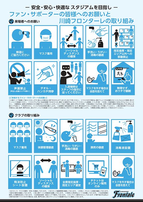 クラブとしてもこれまで以上に感染拡大防止の取り組みを実施してまいりますが、Jリーグを安全に開催するためには、ファン・サポーターの皆様のご協力が不可欠となりますので、何卒よろしくお願いいたします。 スタジアム内で撮影された全映像(静止画を含む)は、報道等を目的とした各種番組や各種の物販・販促等に使用される場合があります。 |