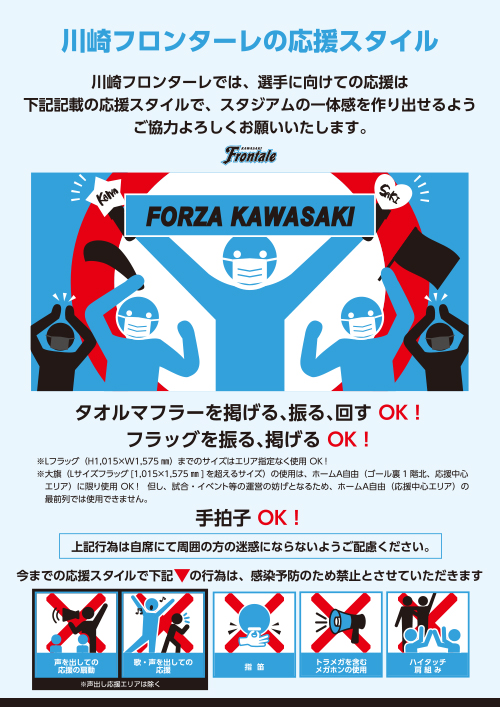 | 声を出しての応援 | ○ 不織布マスク着用が必須 前方(ピッチ方向)を向いた状態 |