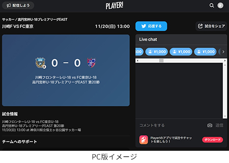 今シーズンもフロンターレアカデミーの選手たちの戦いぶりをタイムリーに皆さんにお届けするため、スポーツライブエンターテイメントアプリ「Player!」にて試合速報を実施します。皆様ぜひご覧ください。