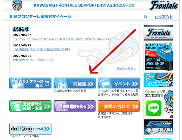 ①試合開催日5日前の午前10:00~試合前々日の16:00:申込期間 後援会マイページへログイン後、希望する試合の列抽選の申し込みをしてください。 |