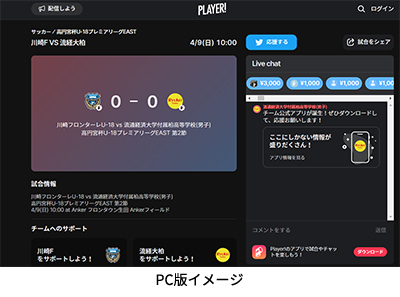 今シーズンもフロンターレアカデミーの選手たちの戦いぶりをタイムリーに皆さんにお届けするため、スポーツライブエンターテイメントアプリ「Player!」にて試合速報を実施します。