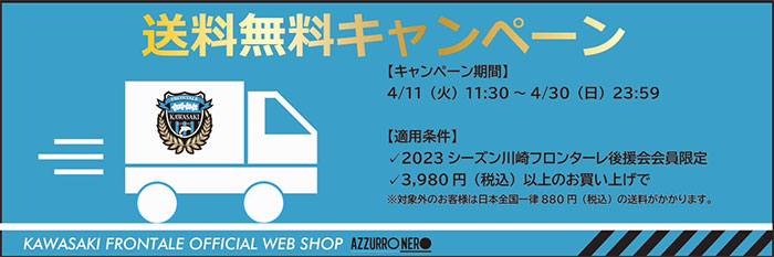 対象期間内に、「2023シーズン川崎フロンターレ後援会会員」の方(ジュニア会員を除く)が3,980円(税込)以上お買い上げいただくと、『送料無料』にてお届けいたします。なお、対象外のお客様はご購入金額にかかわらず、日本全国一律880円(税込)の送料がかかります。