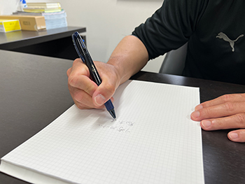 「どんな商品名にしよう...。」と考えに考え抜いて、たどり着いた答えはこちらでした。その名も『鬼木の達(とおる)ペン』。このペンを使っていれば“鬼のような受験や就活、試験”などに達(とおる)!かも...!?
