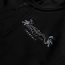 胸元に大きく刺繍加工がされたパーカー。等々力陸上競技場の周りで今シーズンの応援スタイルであるフラッグを大きく振っているサポーターも印象的です。
