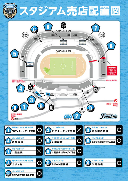 | 設置場所 | ◇メインスタンドD階段横グッズ売店 ◇フロンパーク内グッズ売店 ◇メインスタンド とどろきフロンストア前 ◇アズーロ・ネロ |