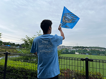スタジアムに来場するサポーターの皆さんに、家を出るときから青色の服やグッズを身に着けてスタジアムまで足を運んでもらい、スタジアムで観戦する際にも青色のフラッグやタオル等を使って応援してもらうことで、川崎の街やスタジアムのスタンドをフロンターレカラーで染め、川崎フロンターレのホームタウン・ホームスタジアムにふさわしい一体感のある雰囲気を作り上げることを目的とした活動です。