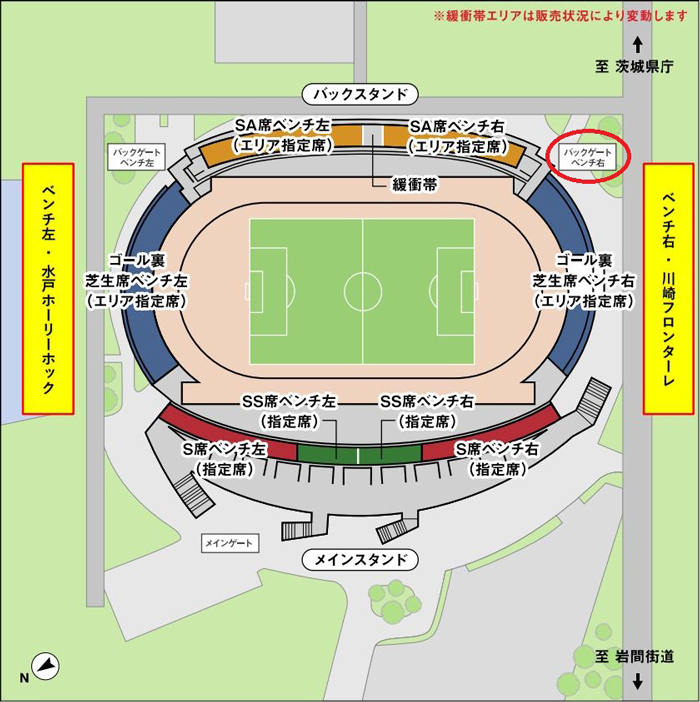 | チケットにおけるベンチ左チームとベンチ右チームの区別 | あり(水戸ホーリーホック:ベンチ左側、川崎フロンターレ:ベンチ右側) |