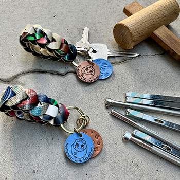 | 内容 | 廃棄するサッカーボールから裁断した小さなパーツを組み合わせて作るキーホルダーです。 組み合わせて作ったキーホルダーに名前や番号を刻印したチャームを付けて完成。 |