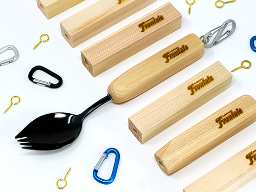 フロンターレロゴ入りの木製グリップを自分好みに紙やすりで削ってつくるマイカトラリーづくりです。カラビナでバッグに吊り下げれば、スタグルで使えてエコにも貢献!