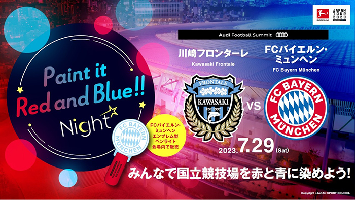 会場内演出コンセプトとして、バイエルンホームスタジアムの「アリアンツ・アレーナ」を再現することを掲げ、試合当日のさまざまな演出プランの準備が進められています。その一つとして、バイエルンとフロンターレ両クラブのテーマカラーでスタジアム内を彩る「Paint it Red and Blue!! Night in国立競技場」が開催されます。