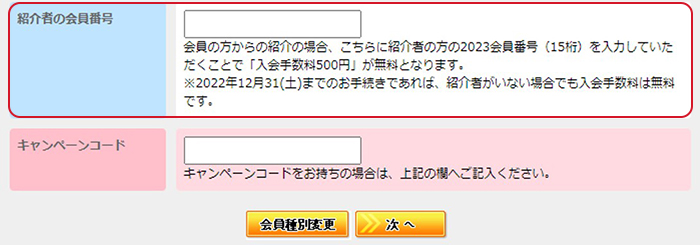 ご入会の際に、入会ページの「紹介者の会員番号」欄に紹介者の会員番号をご入力ください。