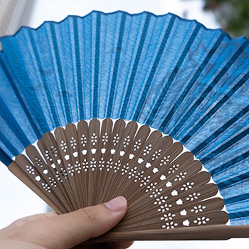 広げた時の扇形により、自然の風を感じることができるのが扇子の良さ。扇面部分は、友禅染めの技法のひとつでもある捺染を追求した京都の染色工場で、丁寧に染め上げています。また、扇骨も京都の扇子処が吟味した竹材を用いています。中骨部分にカブレラのヘタがデザインされているのもポイントです!